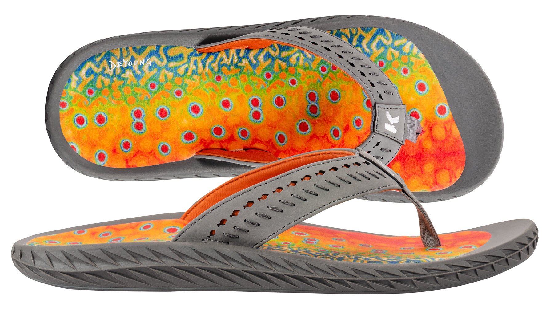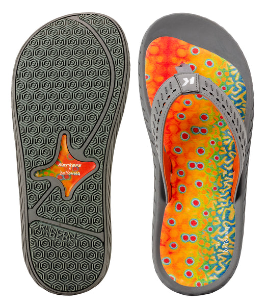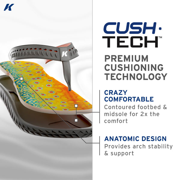 All-day comfort with art and sole. Featuring Cush-Tech™ anatomical molded premium EVA. Grip all terrain with a non-marking Kling-On Deck™ rubber with incredible grip on wet surfaces. Not to forget the star of the show, beautiful fish prints from Derek DeYoung one of the greatest fish artists of our time.