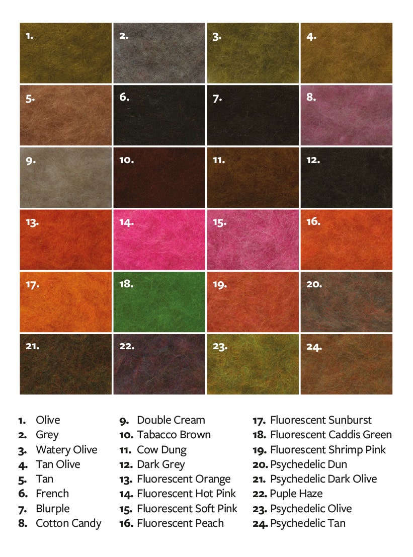 ULTRA NYMPH DUB boasts a one-of-a-kind mixture of natural and synthetic fibers, creating a delicate and see-through texture. Elevate your nymph patterns with this dubbing, carefully designed with a mix of two natural fibers and two synthetic materials. One of the synthetics adds a subtle, yet eye-catching sparkle to your flies. With 24 unique colors available, this expertly dyed and blended dubbing is like no other. It's versatile enough for various pattern styles, but particularly perfect for Euro nymphs and shrimp patterns. Don't miss out on the range of psychedelic colors offered, which may appear muted at first but truly shine when illuminated. Each pack contains 1 gram of this must-have dubbing.