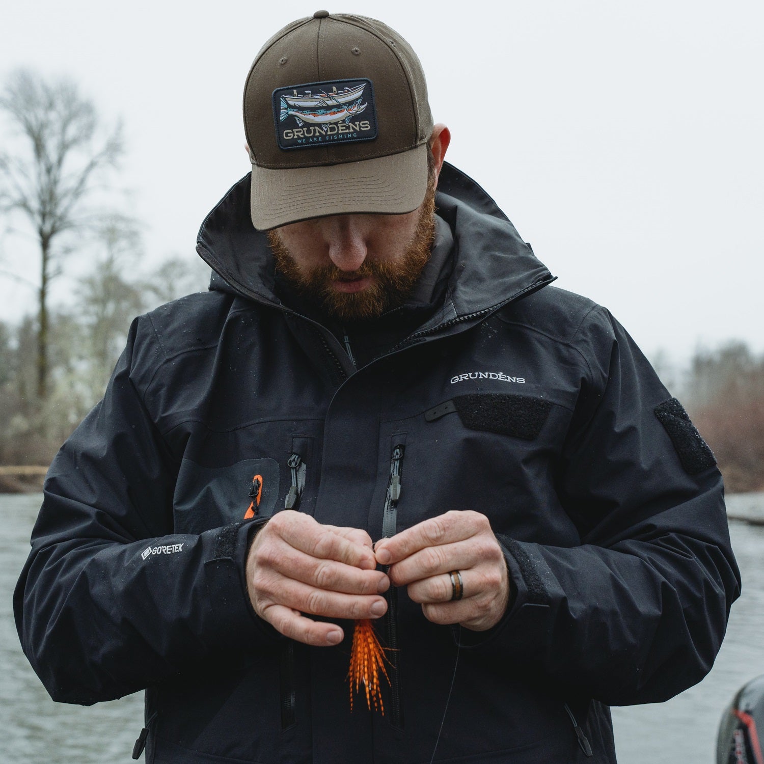 The Grundéns Drift Boat Trucker features a custom drift boat and giant trout design sure to inspire you to make that "one last cast" for a true river monster. Mid-crown trucker hat construction with adjustable snapback closure.